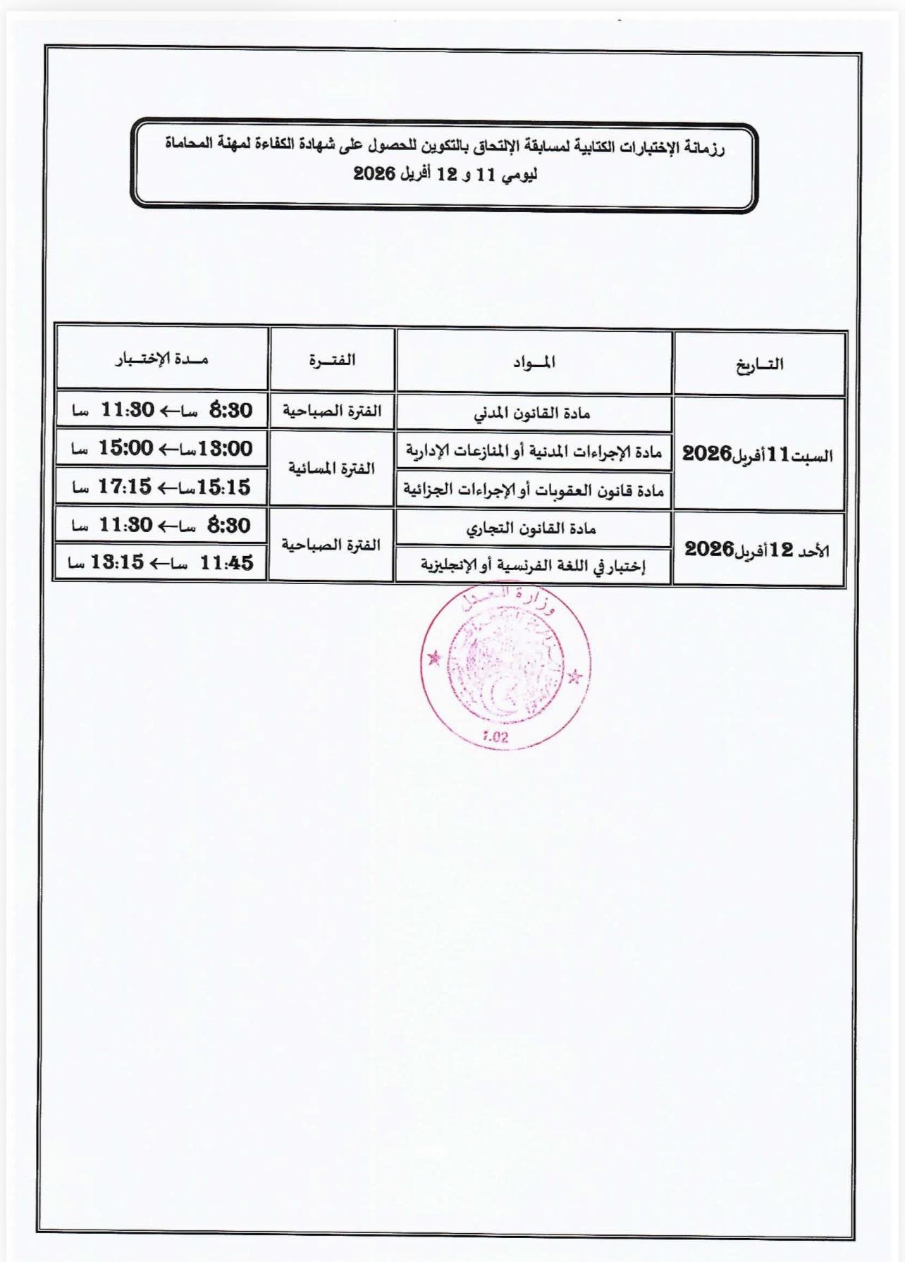 08 نيسان,2026 آخر المستجدات زنامة الاختبارات الكتابية لمسابقة الالتحاق بالتكوين للحصول على شهادة الكفاءة مهنية لمهنة المحاماة #إعلان_هام #شهادة_الكفاءة_لمهنة_المحاماة رزنامة الاختبارات الكتابية لمسابقة الالتحاق بالتكوين للحصول على شهادة الكفاءة مهنية لمهنة المحاماة ليومي 11 و12 أفريل 2026 المقال التالي: الاجتماع التحضيري لمسابقة الكفاءة لمهنة المحاماة التالي